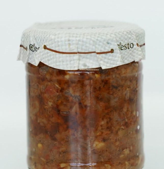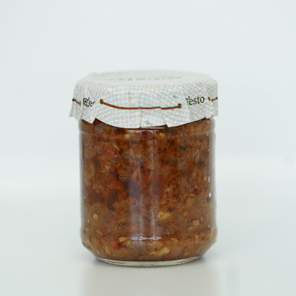 In questo mix di sapori della tradizione calabrese, cipolla rossa di Tropea IGP e pomodoro secco conferiscono al prodotto un gusto unico ed inconfondibile.