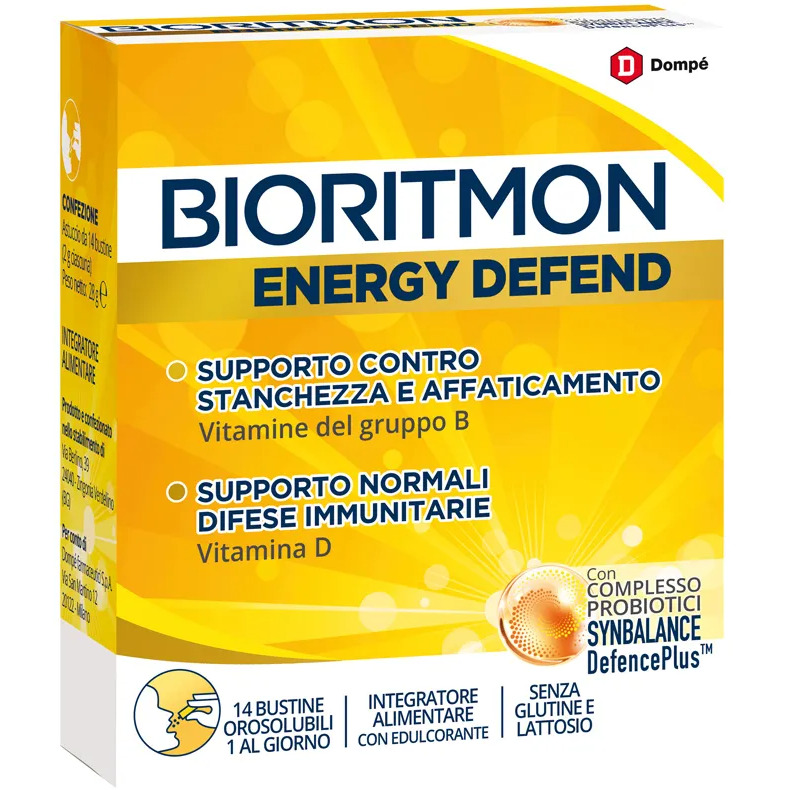 Bioritmon Energy Defend è un integratore alimentare a base di vitamine del gruppo B, vitamina D, probiotici, frutto-oligosaccaridi. Le vitamine B6, B9 e B12 contribuiscono al normale metabolismo energetico e aiutano a ridurre stanchezza e affaticamento. La vitamina D supporta il normale funzionamento del sistema immunitario. I probiotici e i frutto-oligosaccaridi favoriscono l’equilibrio della flora intestinale. Synbalance DefencePlus è un complesso di 3 ceppi di probiotici studiato in vivo.