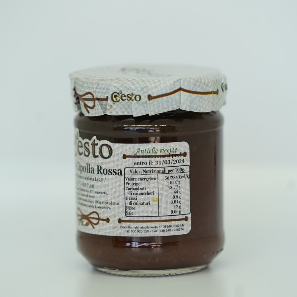 Ingredienti: Cipolla rossa di Tropea Calabria IGP, zucchero, chiodi di garofano, uva passa, tracce di aceto. Frutta utilizzata 55 g per 100 g di prodotto, zuccheri totali 55 g per 100 g di prodotto.