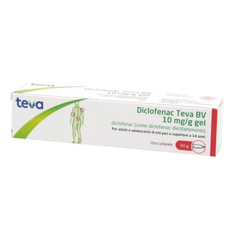 Posologia. Adulti e adolescenti di età pari o superiore a 14 anni: In base all’estensione della parte interessata da trattare, si applica 3-4 volte al giorno un quantitativo di dimensioni variabili tra una ciliegia e una noce, equivalente a 1-4 g di gel (11,6-46,4 mg di diclofenac dietilammonio corrispondenti a 10-40 mg di diclofenac sodico). Questa dose è sufficiente per trattare un’area di 400-800 cm². La dose massima giornaliera è di 16 g di gel, corrispondenti a 185,6 mg di diclofenac, sale di dietilammonio (corrispondenti a 160 mg di diclofenac sodico). La durata d’uso dipende dai sintomi e dalla malattia di base. Diclofenac Teva BV non può essere usato per più di una settimana senza consultare il medico. Se i sintomi peggiorano o non migliorano entro 3-5 giorni, occorre consultare il medico. Gruppi di pazienti speciali. Pazienti anziani: Non sono richiesti speciali adeguamenti della dose. A causa del potenziale profilo di effetti indesiderati, le persone anziane devono essere sottoposte ad un attento monitoraggio. Pazienti con compromissione della funzionalità renale: Non è necessaria alcuna riduzione della dose per i pazienti con compromissione della funzionalità renale. Pazienti con compromissione della funzionalità epatica: Non è richiesta alcuna riduzione della dose per i pazienti con compromissione della funzionalità epatica. Bambini e adolescenti (al di sotto dei 14 anni): Non sono disponibili dati sufficienti sull’efficacia e la sicurezza nei bambini e negli adolescenti al di sotto dei 14 anni (vedere paragrafo 4.3). Modo di somministrazione: Per uso cutaneo. Si applica un sottile strato di gel sulle parti del corpo interessate e si friziona delicatamente per farlo penetrare nella pelle. Le mani devono essere lavate a meno che non siano la zona da trattare. Prima di applicare un bendaggio (vedere paragrafo 4.4), occorre lasciar asciugare il gel sulla pelle per qualche minuto.