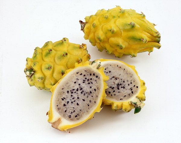 Anche detta Pitaya, è un frutto esotico, variante del più noto Dragon fruit rosso. La polpa al suo interno è ricchissima di piccoli semi neri ed è generalmente di colore bianco, presentandosi al gusto come dolce, fragrante e succosa. Ha numerose proprietà benefiche e contiene al sui interno ingenti quantità di fibre, sali minerali come calcio, ferro e fosforo, proteine e vitamine A e C.