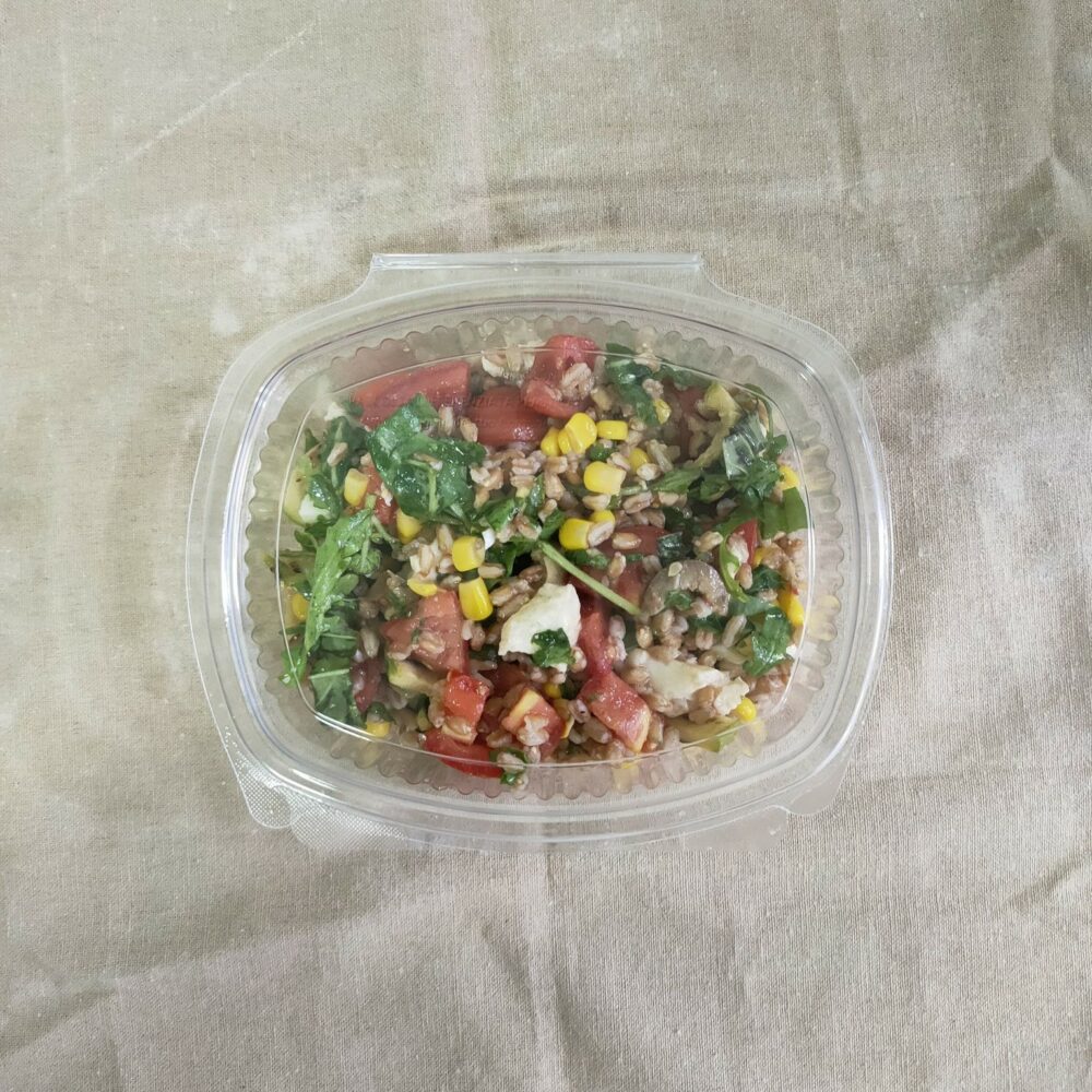 Ingredienti: farro, pomodoro, rucola, mais, olive, mozzarella, olio, sale.