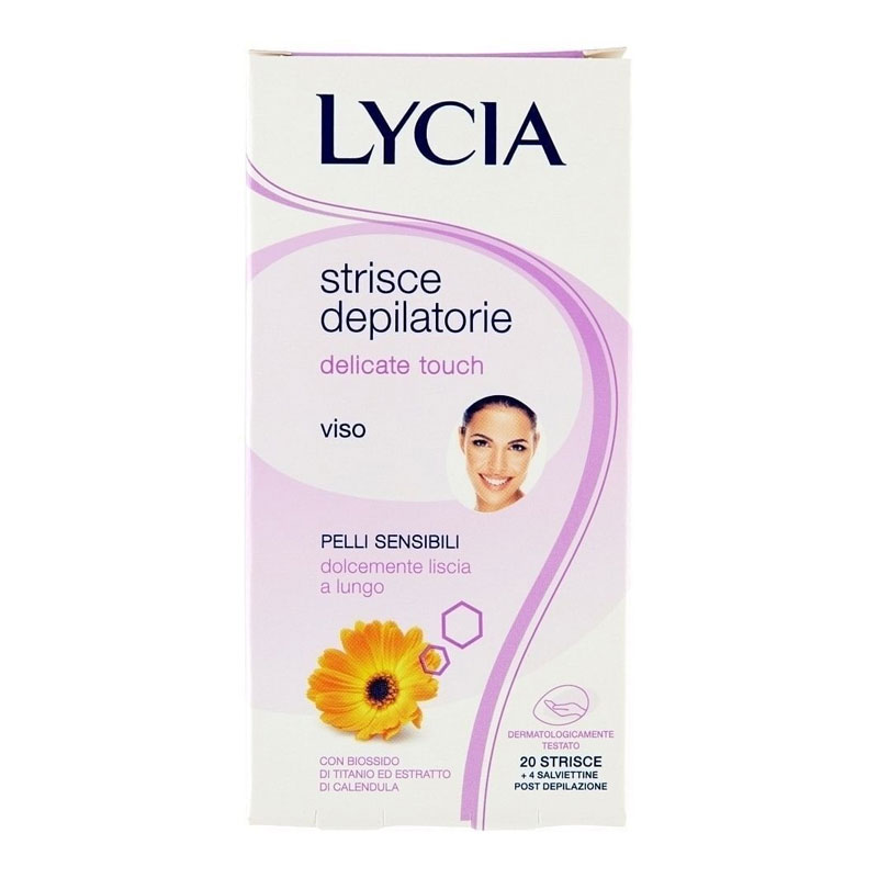 Lycia strisce depilatorie viso, studiata appositamente per pelli sensibili, arricchita con estratto di calendula, dalle proprietà lenitive ed emollienti, e biossido di titanio per uno strappo più delicato.