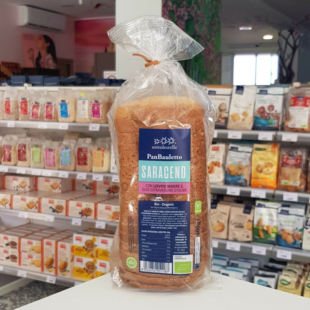 Frutto della paziente e straordinaria lievitazione naturale mediante l’impiego del lievito madre Sottolestelle. Digeribile e soffice, con un intenso bouquet di aromi, il pane bauletto al grano saraceno è dolcificato con il delicato sciroppo di riso e l’unico grasso utilizzato è l’olio extravergine d’oliva. Ideale come base per spalmare creme e salse preferite o per per preparare bruschette o toast.
