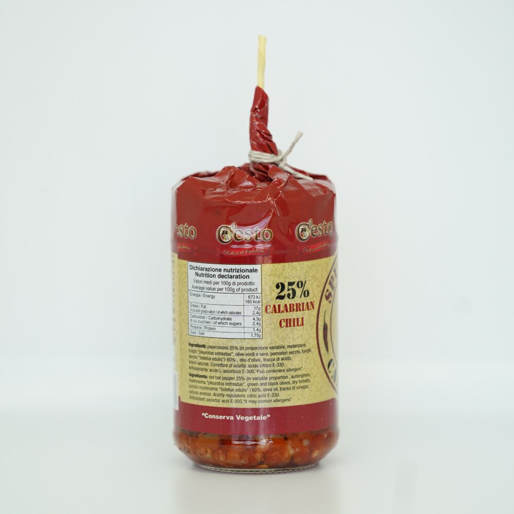 Ingredienti: Peperoncino calabrese 25%, (in proporzione variabile melanzane, funghi “pleurotus ostreatus”, olive verdi e nere, pomodori secchi, funghi porcini “boletus edulis”), 60%, olio di oliva, sale, acqua, tracce di aceto.