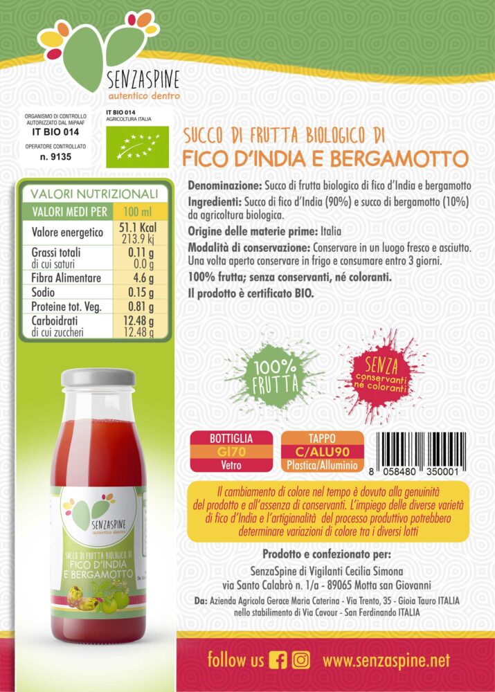 SenzaSpine propone succhi di frutta biologici in due varianti: fico d’India e limone e fico d’India e bergamotto.