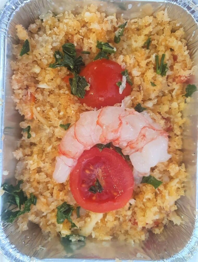 Gambero di nassa, provola, grana padano, mollica, pomodorini, prezzemolo, olio d’oliva, sale.